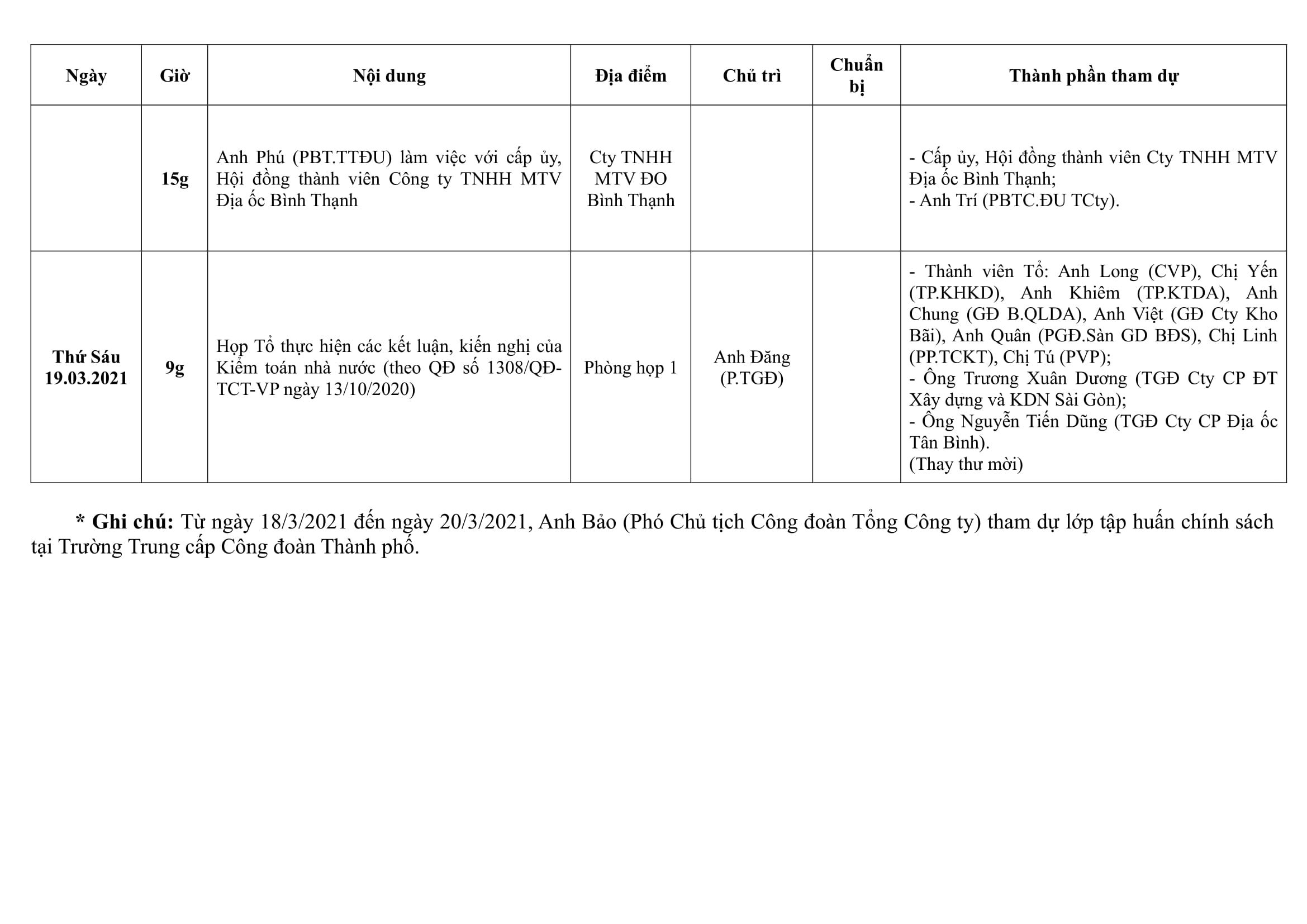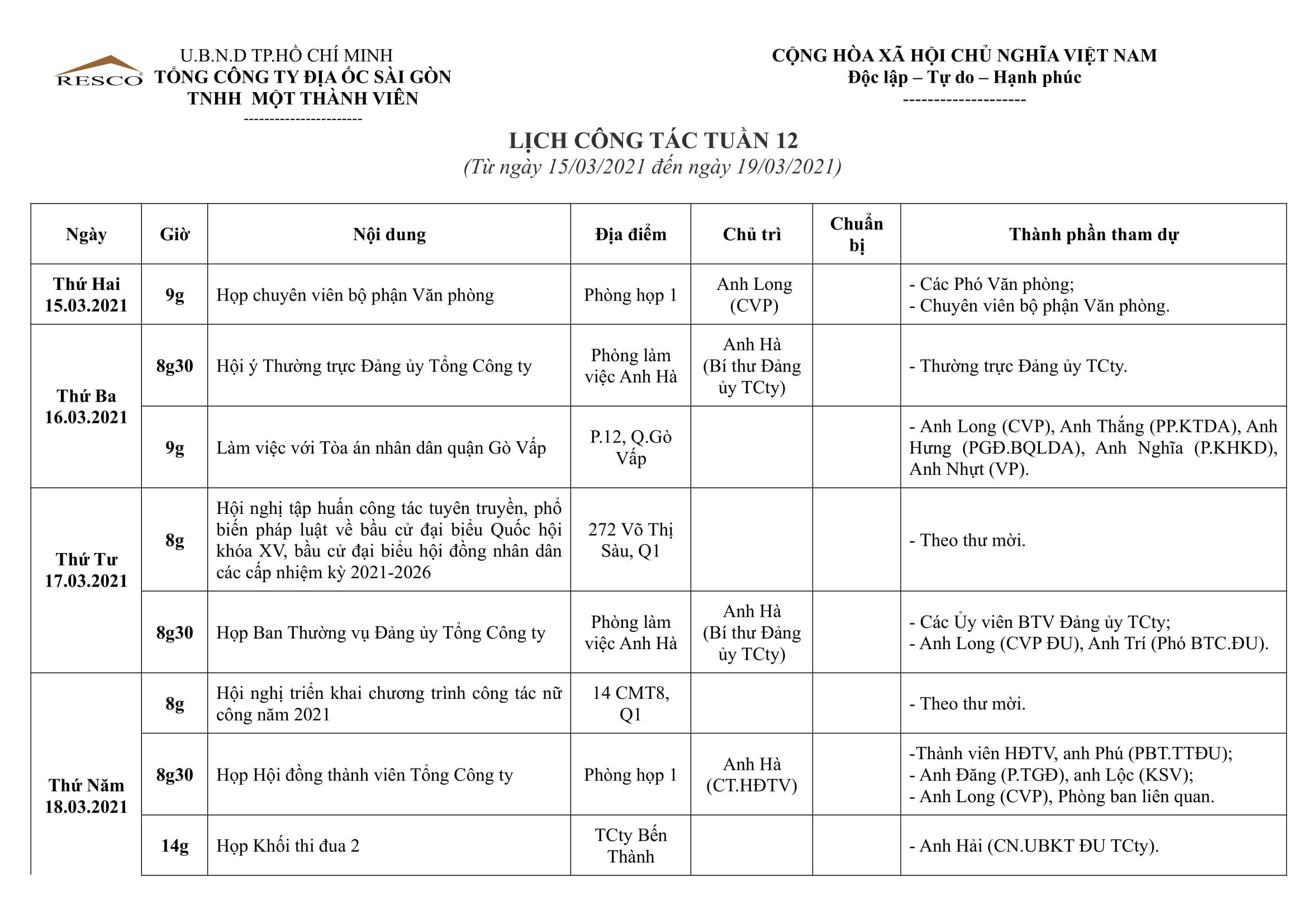 3. Lịch công tác tuần 12 (Từ ngày 15/3/2021 đến ngày 19/3/2021)