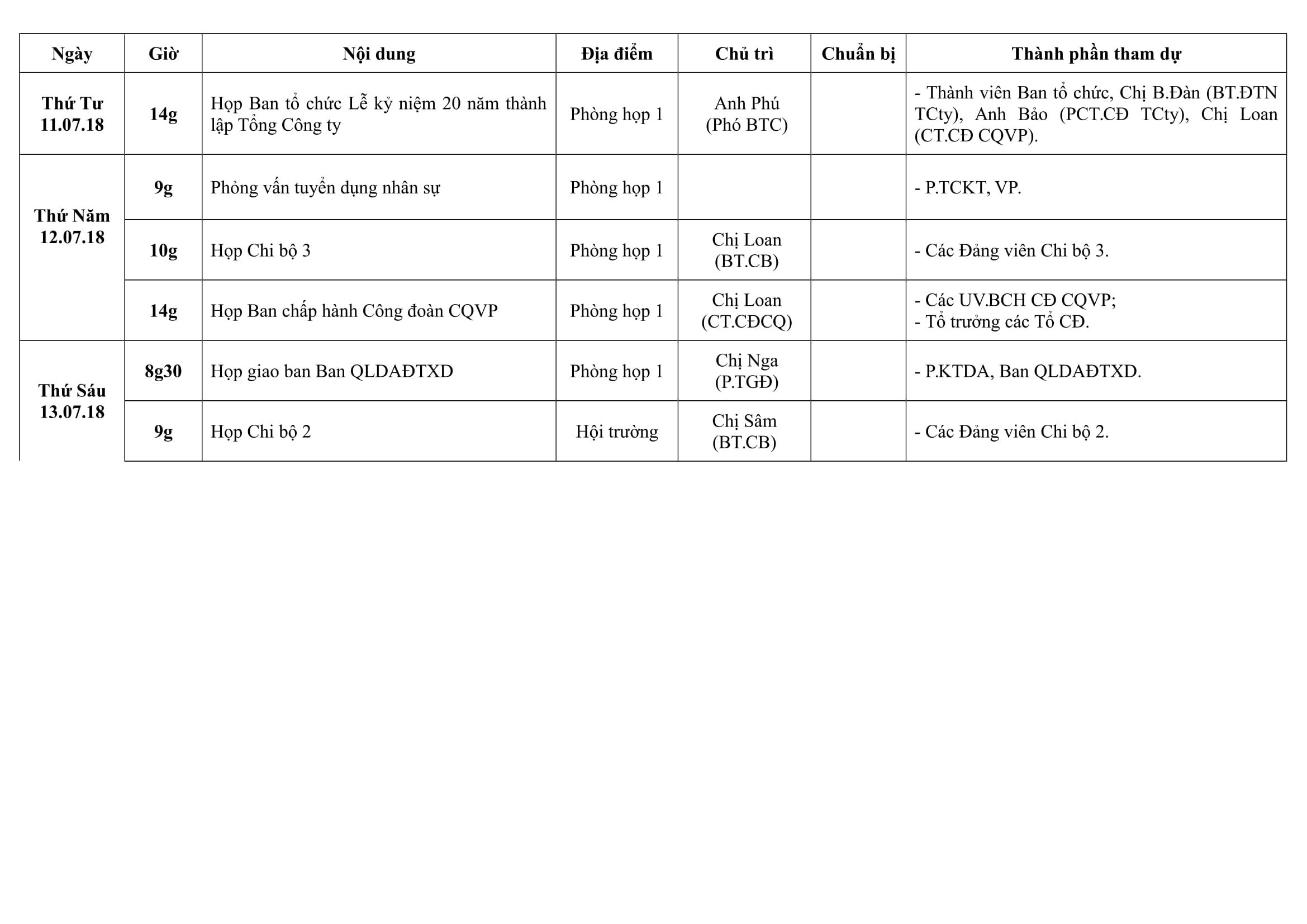 Lịch công tác tuần 28 (Từ ngày 09/7/2018 đến ngày 13/7/2018)