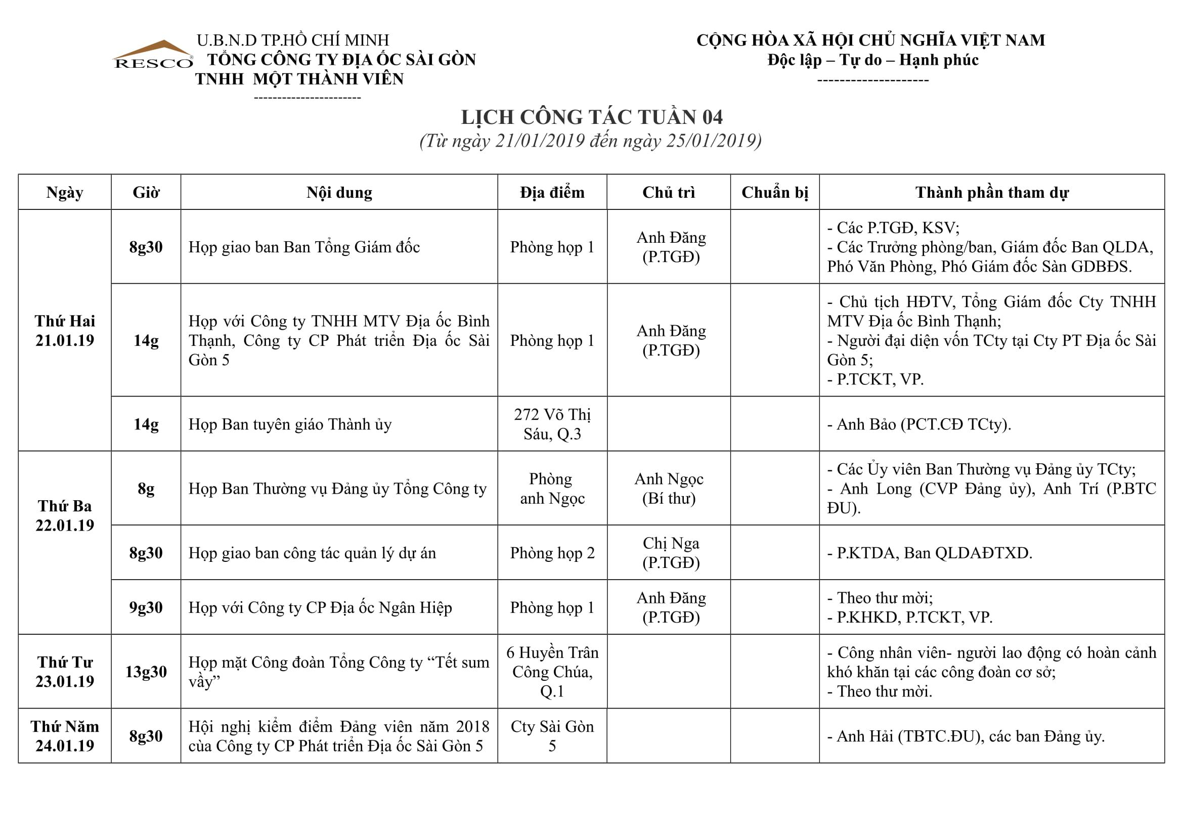 Lịch công tác tuần 4 (Từ ngày 21/01/2019 đến ngày 25/01/2019)