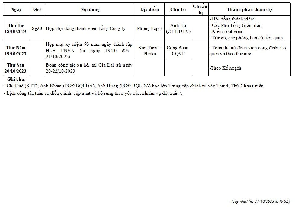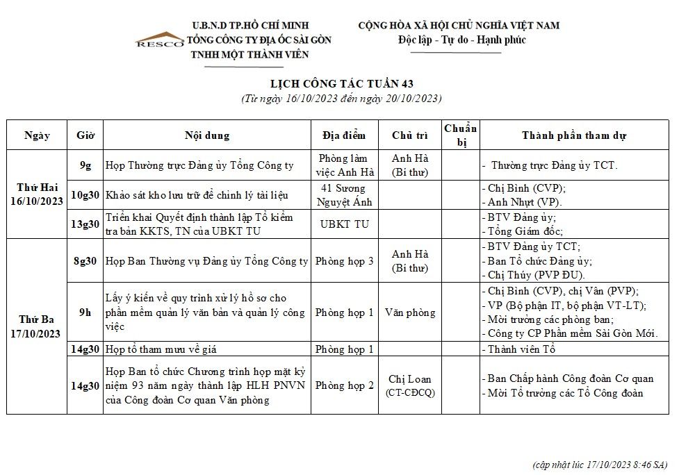 Lịch công tác tuần 43 (Từ ngày 16/10/2023 đến ngày 20/10/2023)