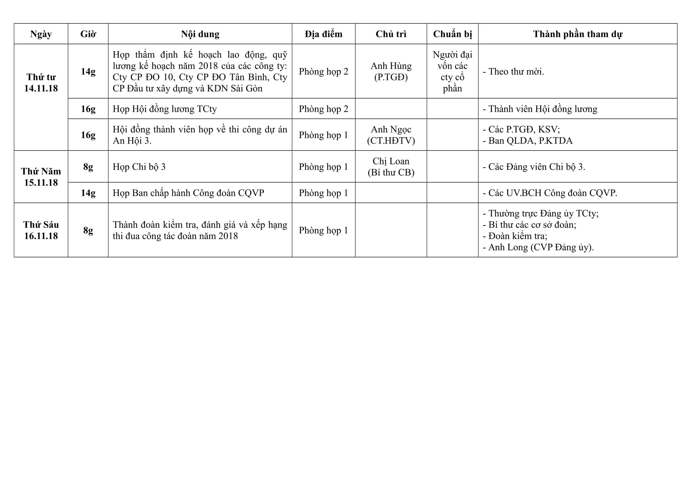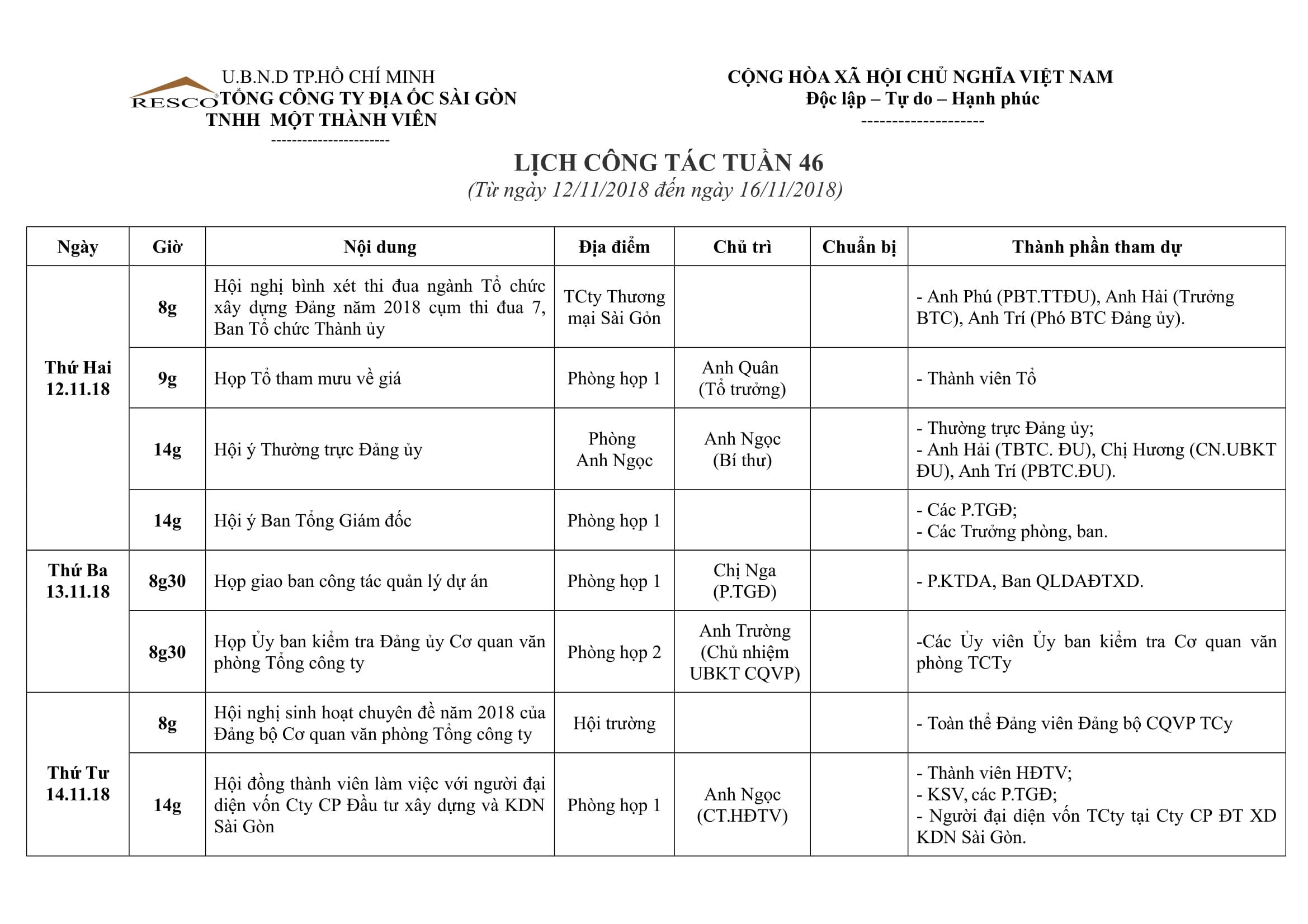Lịch công tác tuần 46 (từ ngày 12/11/2018 đến ngày 16/11/2018)