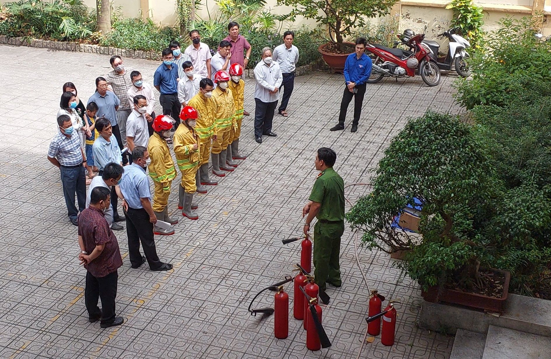 Sau khi thực tập với tình huống giả định, cán bộ Đội PCCC và cứu nạn, cứu hộ - Công an Quận 1 hướng dẫn Đội PCCC Tổng Công ty thực tập sử dụng bình chữa cháy dập tắt điểm cháy thật trên khay.